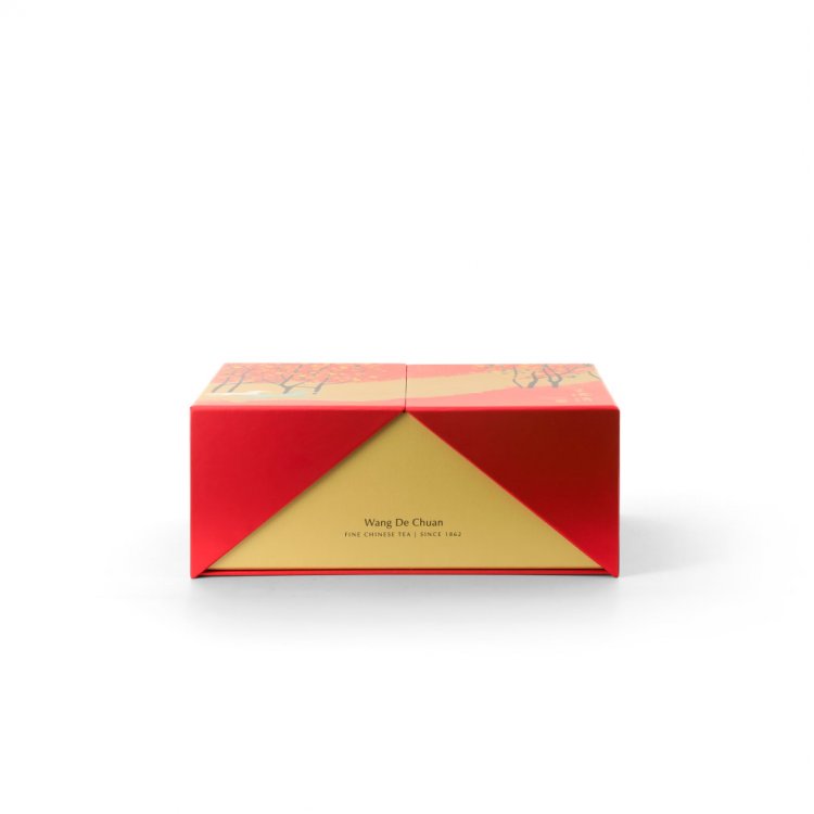 雙開精裝紙盒、銀箔卡紙裱褙印刷,搭配丙午新春限定潤金色茶罐,整體金光層次細緻閃亮耀眼,尺寸小巧易於攜帶,非常適合做為飛行常客的商務禮贈茶選。
