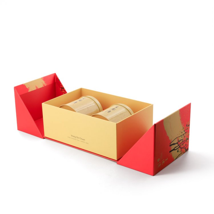 雙開精裝紙盒、銀箔卡紙裱褙印刷、潤金色馬口鐵茶罐