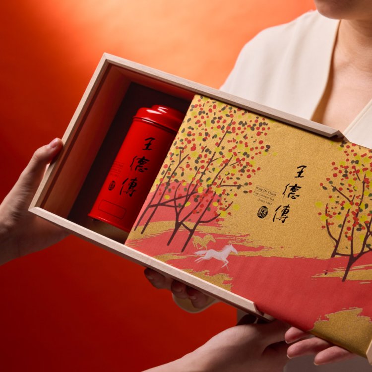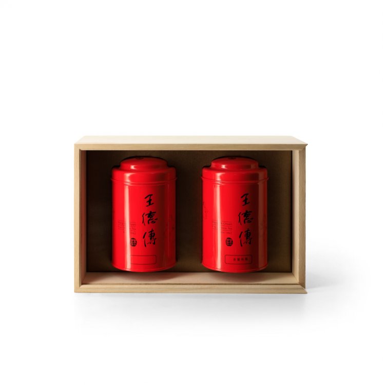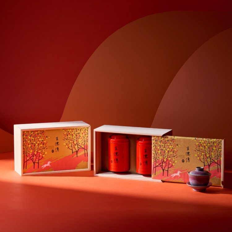 梧桐木抽屜禮盒,絹布盒蓋結合絲網與燙金工藝,質感金光閃耀細緻。馳澄禮盒以德傳經典紅色茶罐,獻上兩款輕重口感的臺灣好茶。