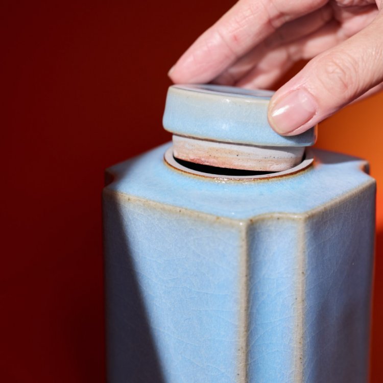 存藏於以青瓷鐵胎土製成的八方青瓷茶倉內
